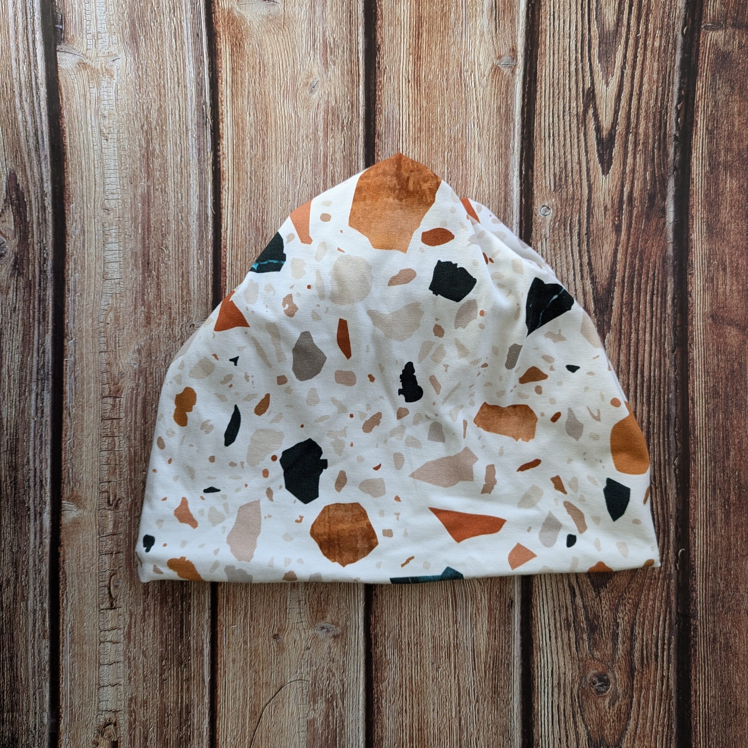 Az Anyacuka copfos sapka kétrétegű, rugalmas pamut jersey anyagból készült , ami az átmeneti időben rendkívül kényelmes viseletet biztosít.