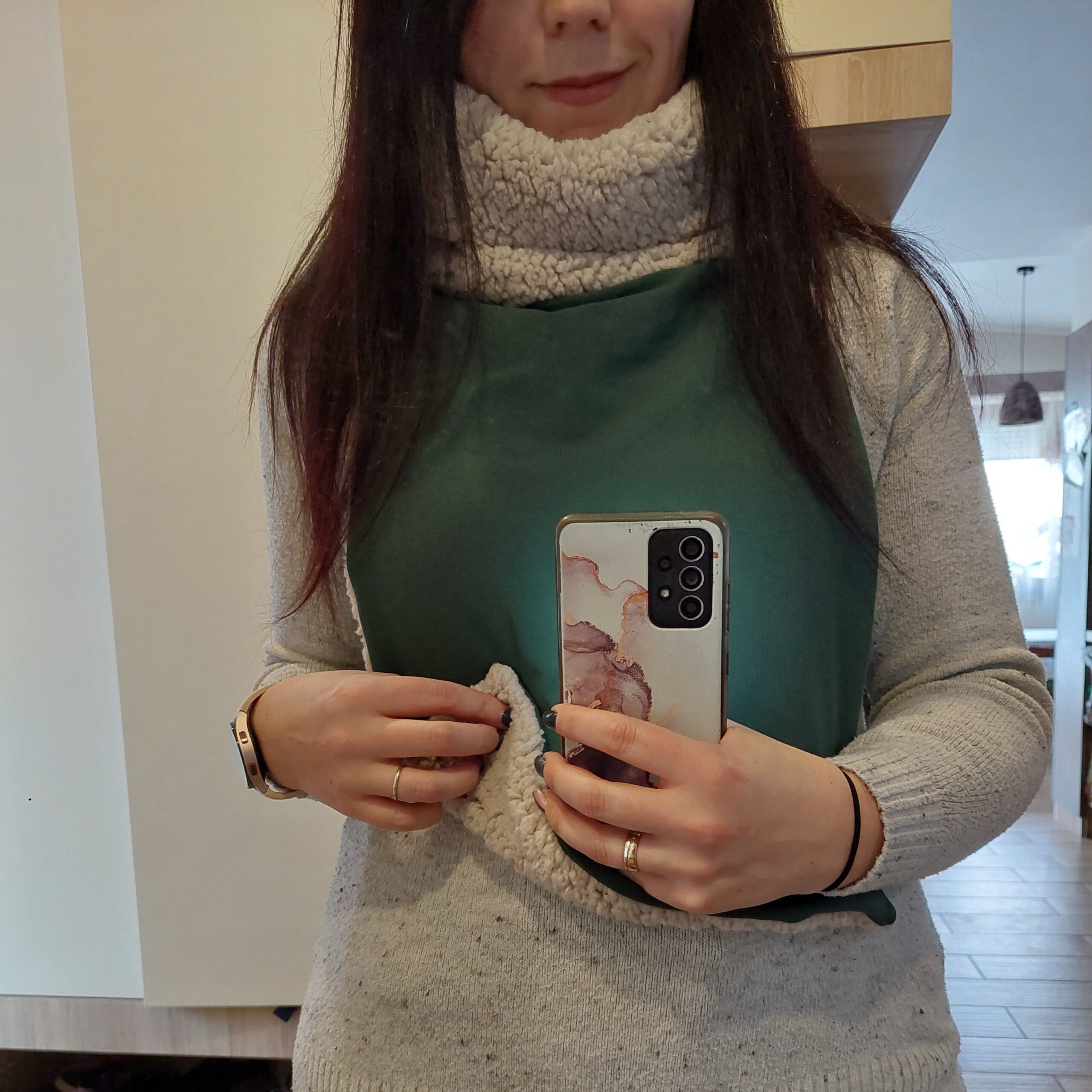 Téli- Extra meleg, puha, rugalmas anyagokból készült sál, ami felhajtva az egész arcot megvédi a szeles hideg időtől, és a mellény részének köszönhetően a mellkas és a hát se fog fázni 🙂