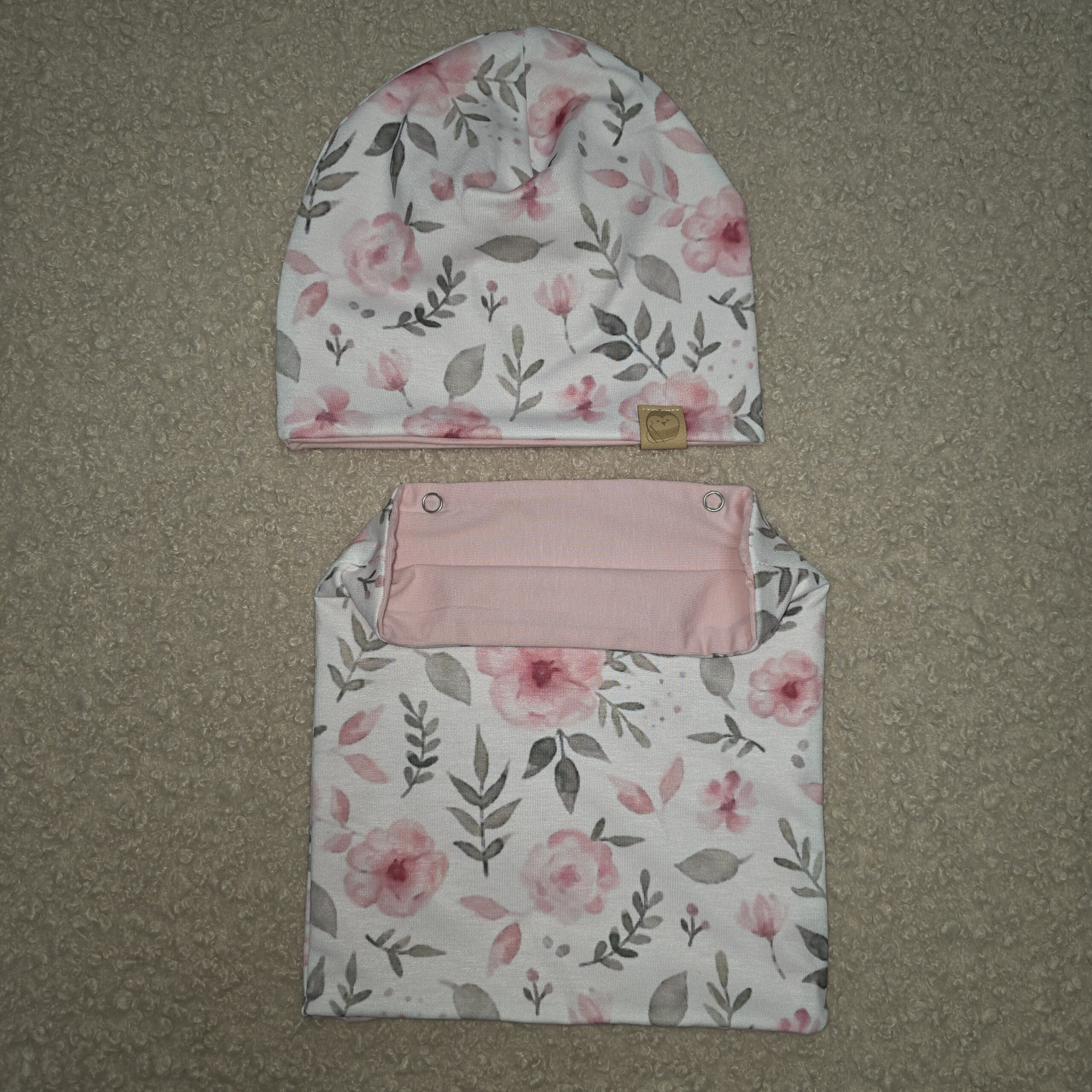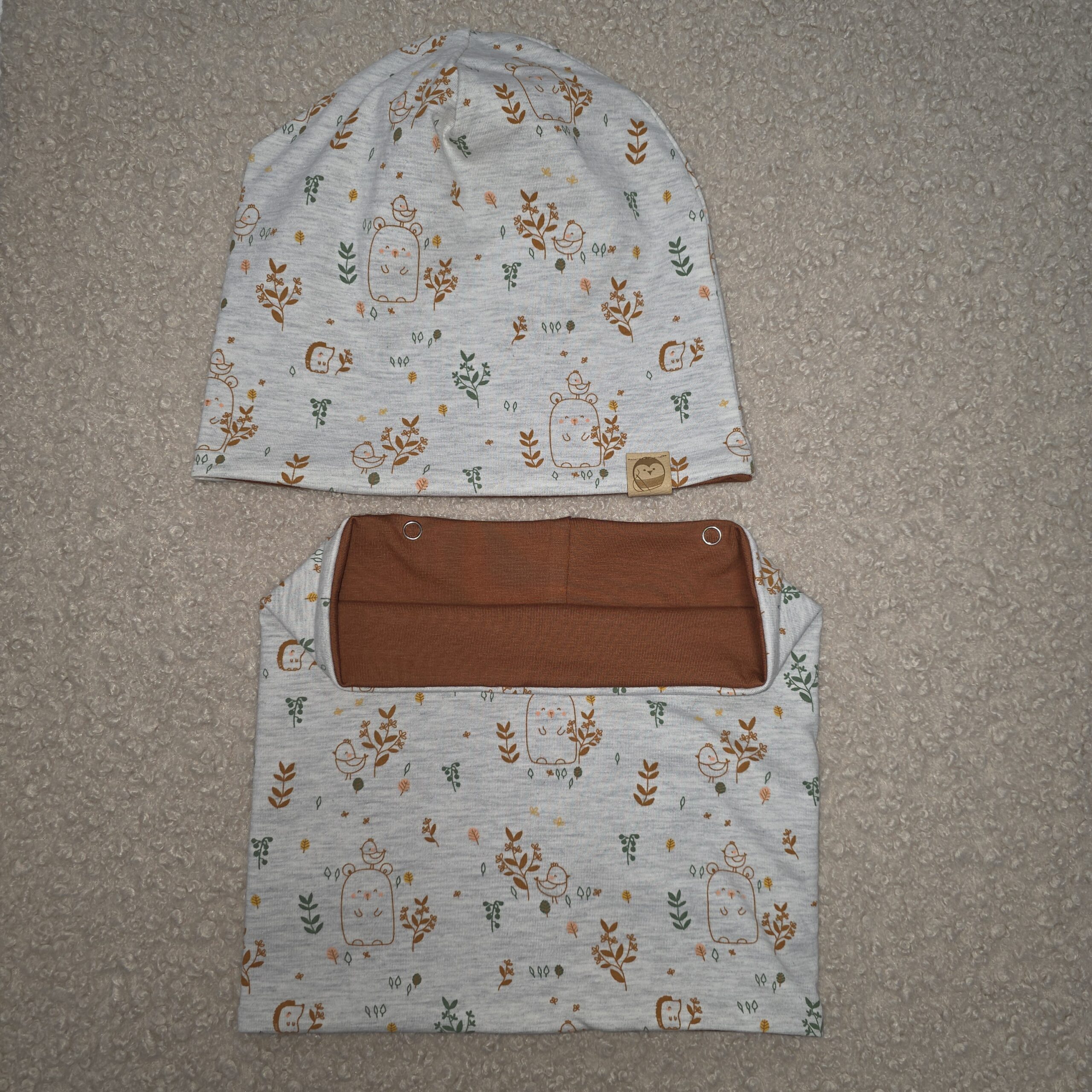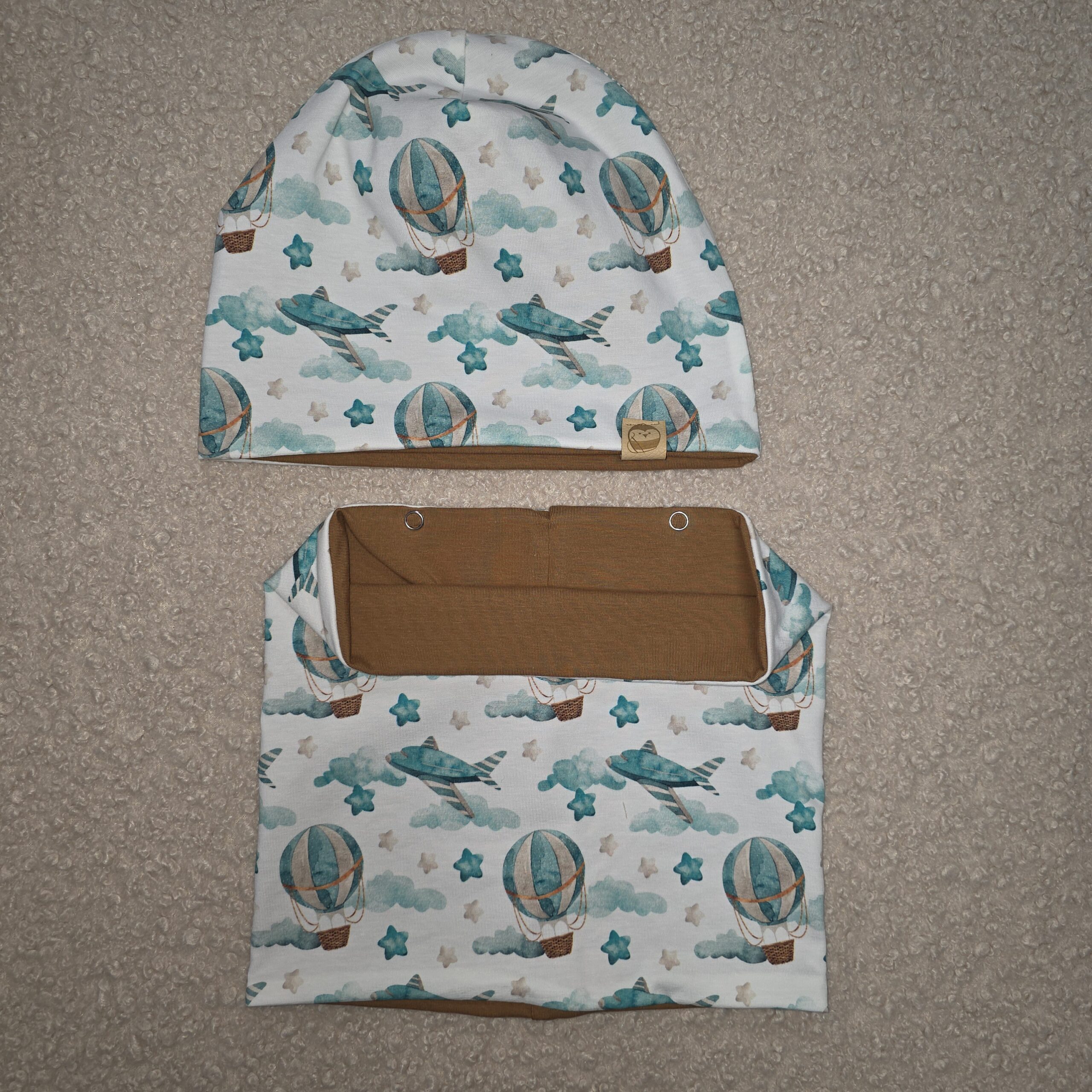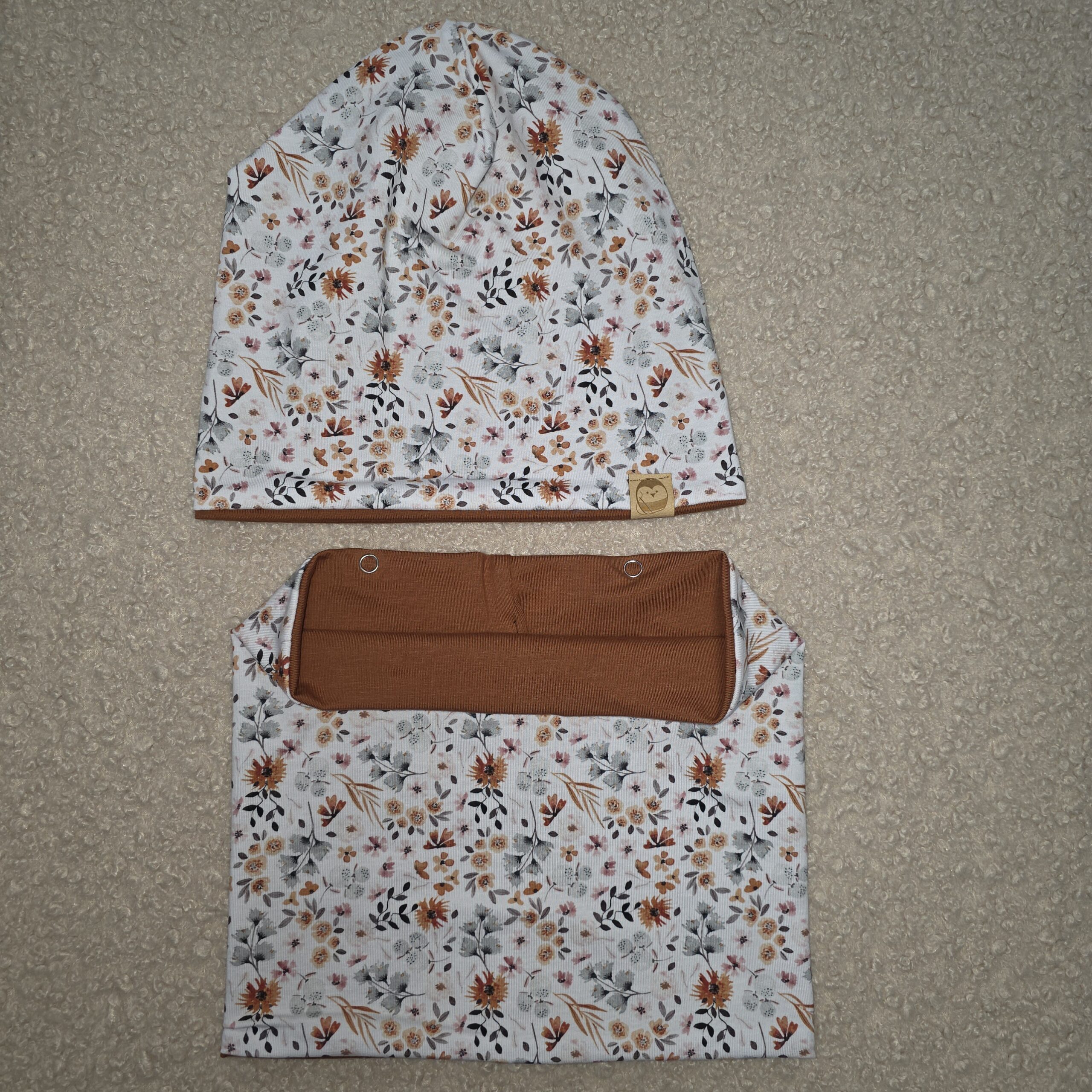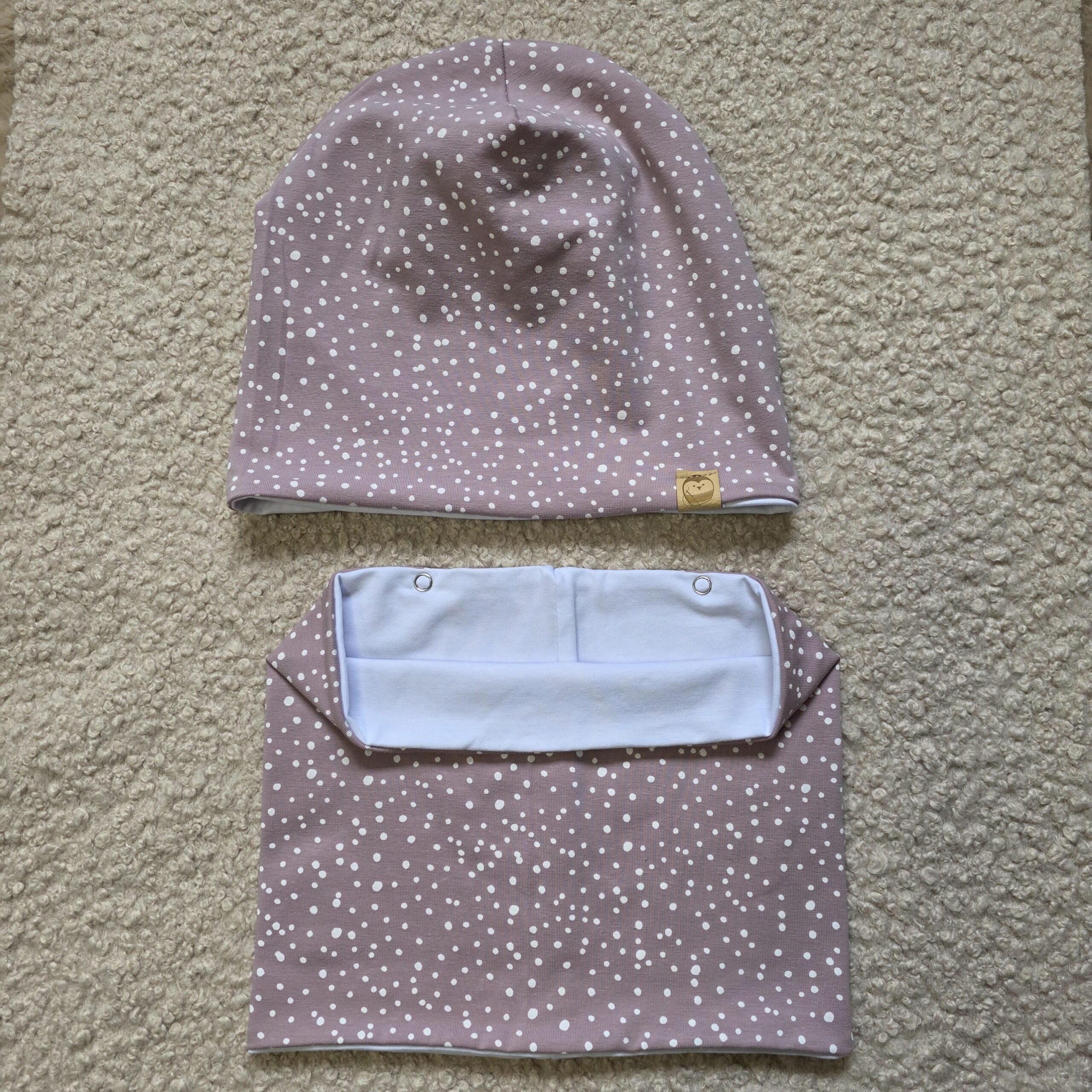 Az Anyacuka sapka-sál szett kétrétegű, rugalmas pamut jersey anyagból készült , ami az átmeneti időben rendkívül kényelmes viseletet biztosít.