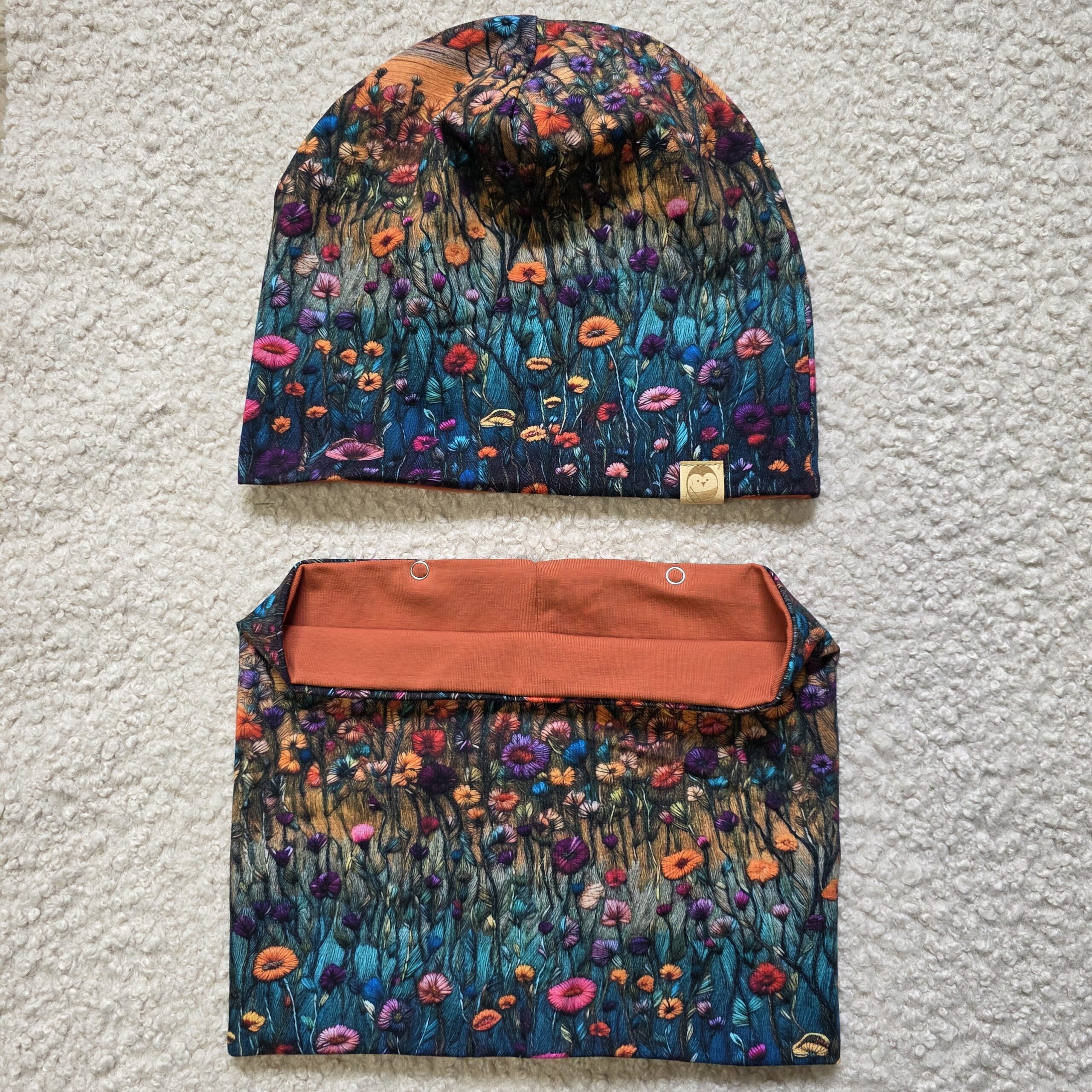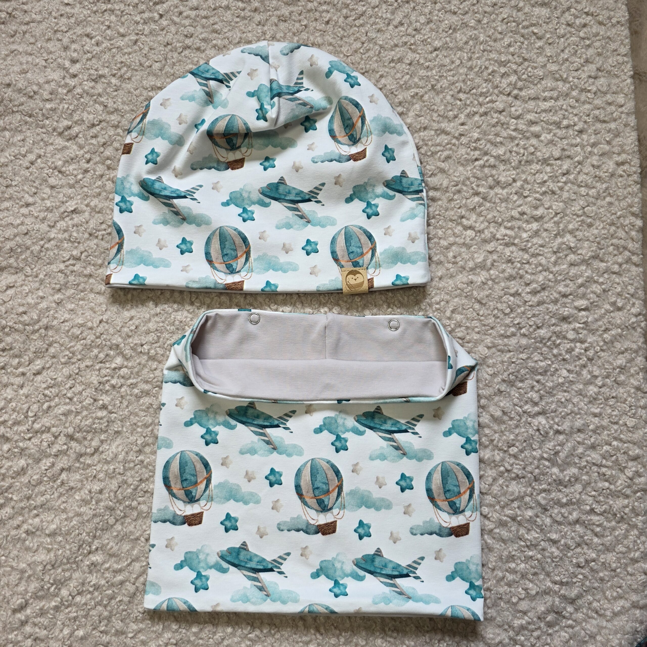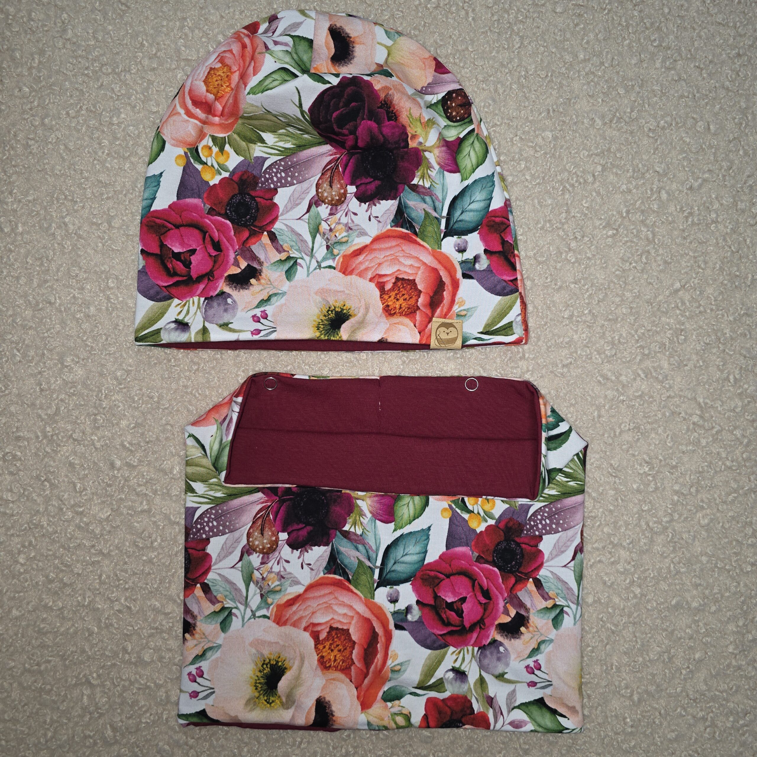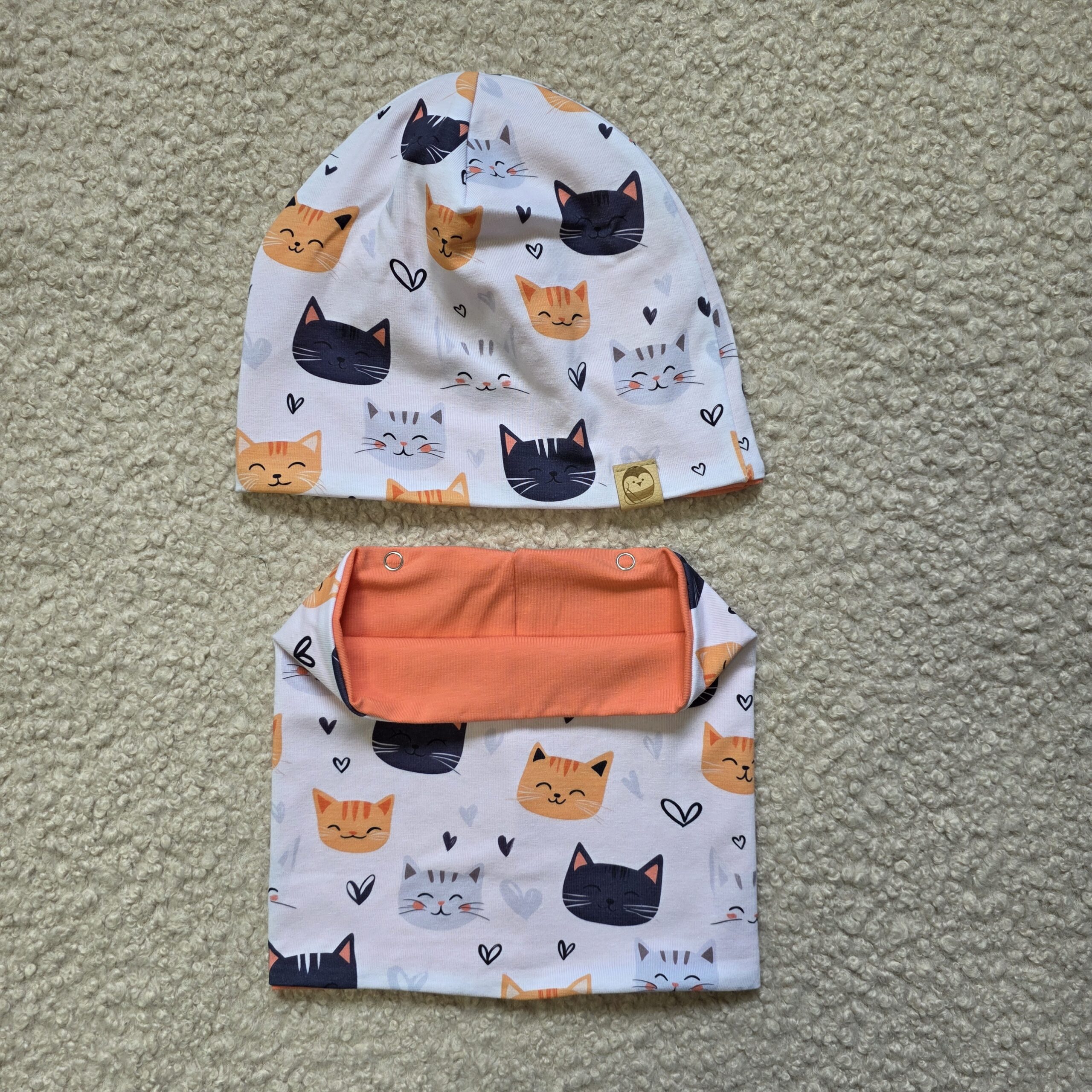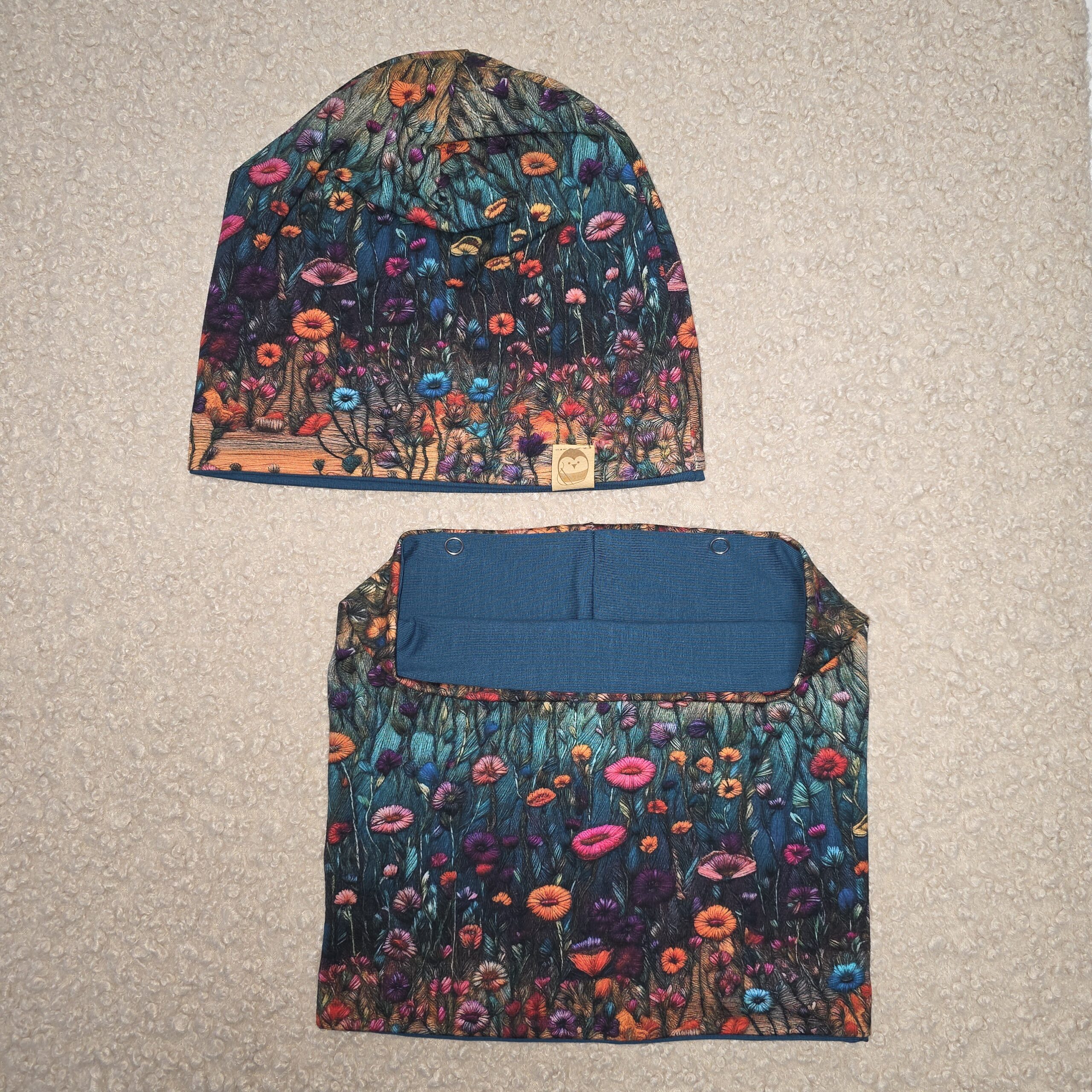 Az Anyacuka sapka-sál szett kétrétegű, rugalmas pamut jersey anyagból készült , ami az átmeneti időben rendkívül kényelmes viseletet biztosít.