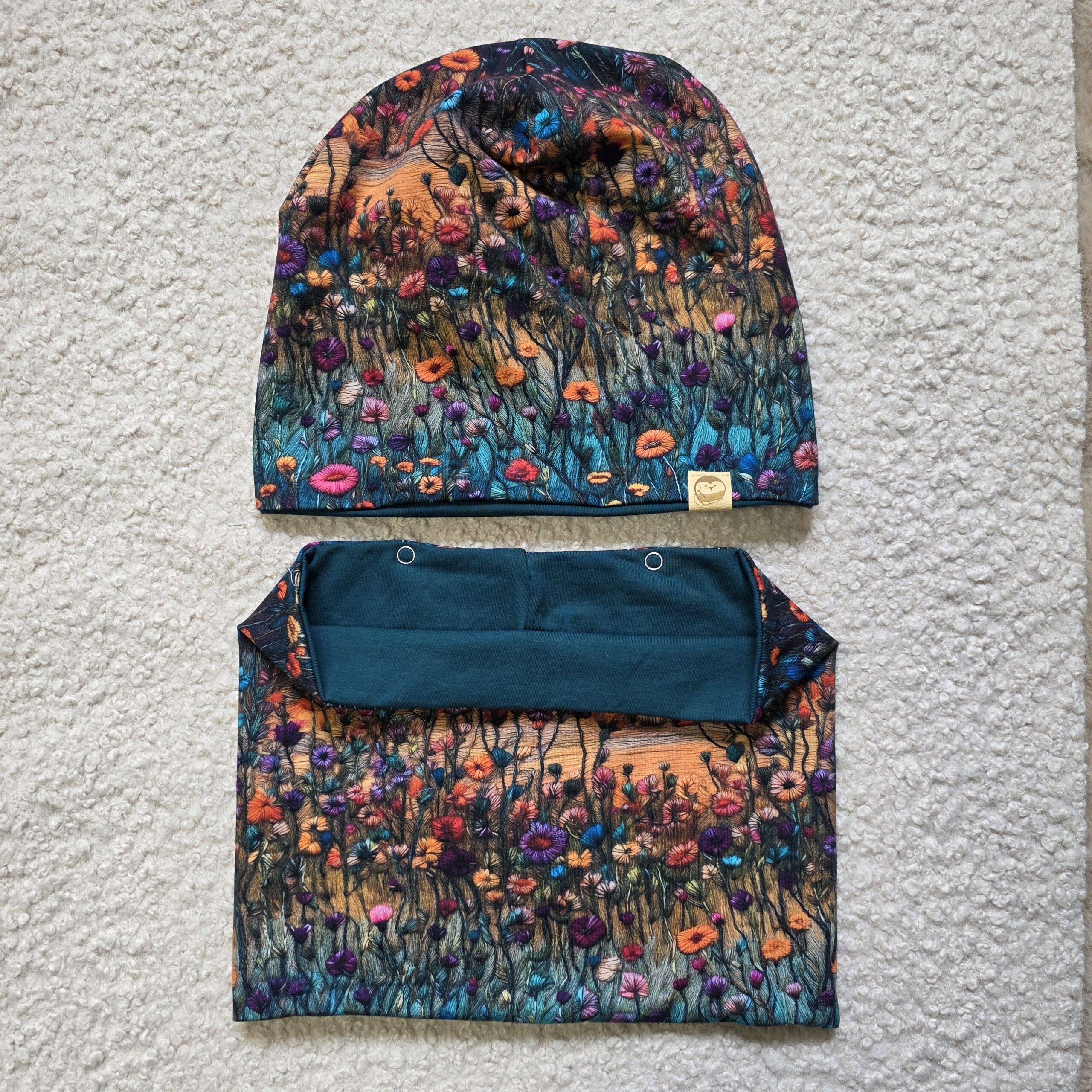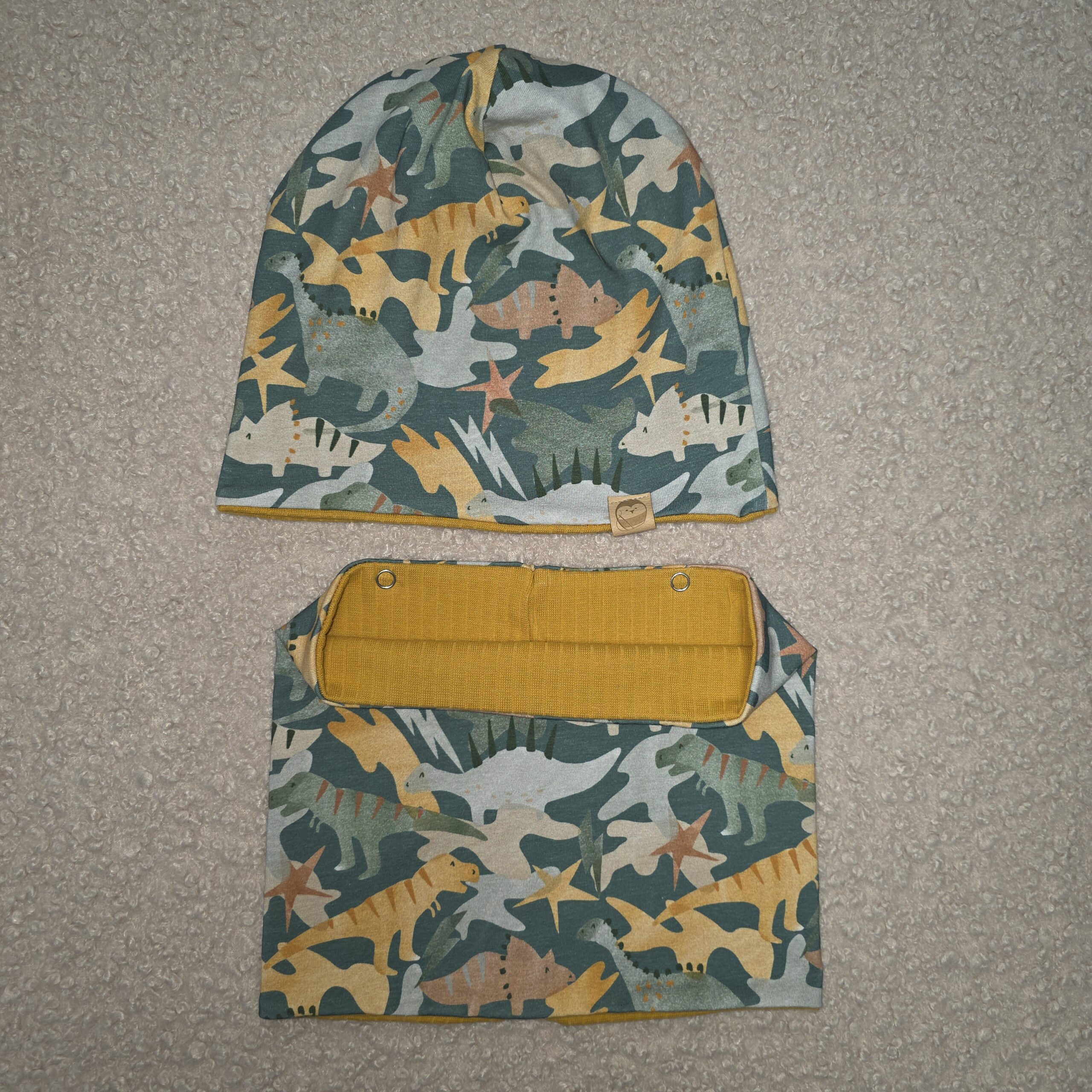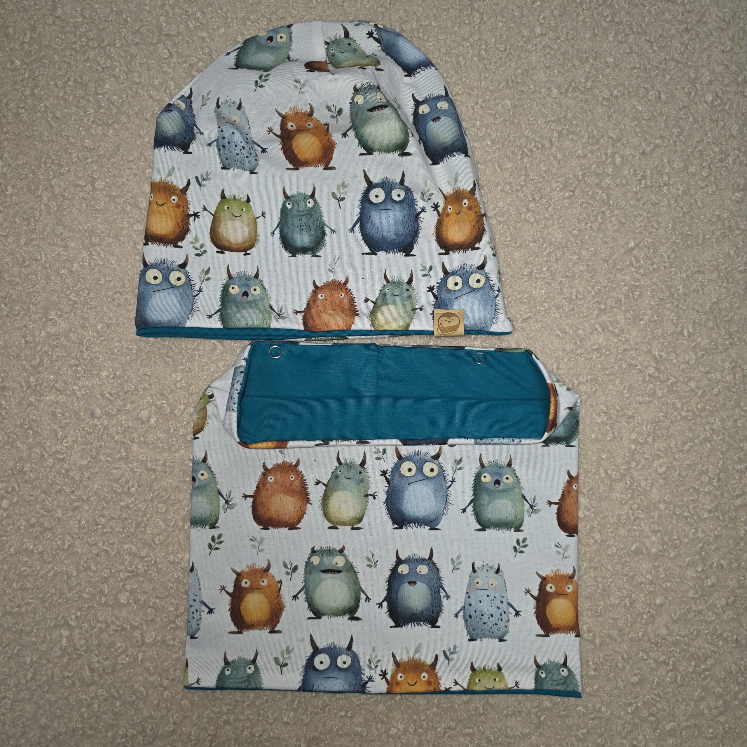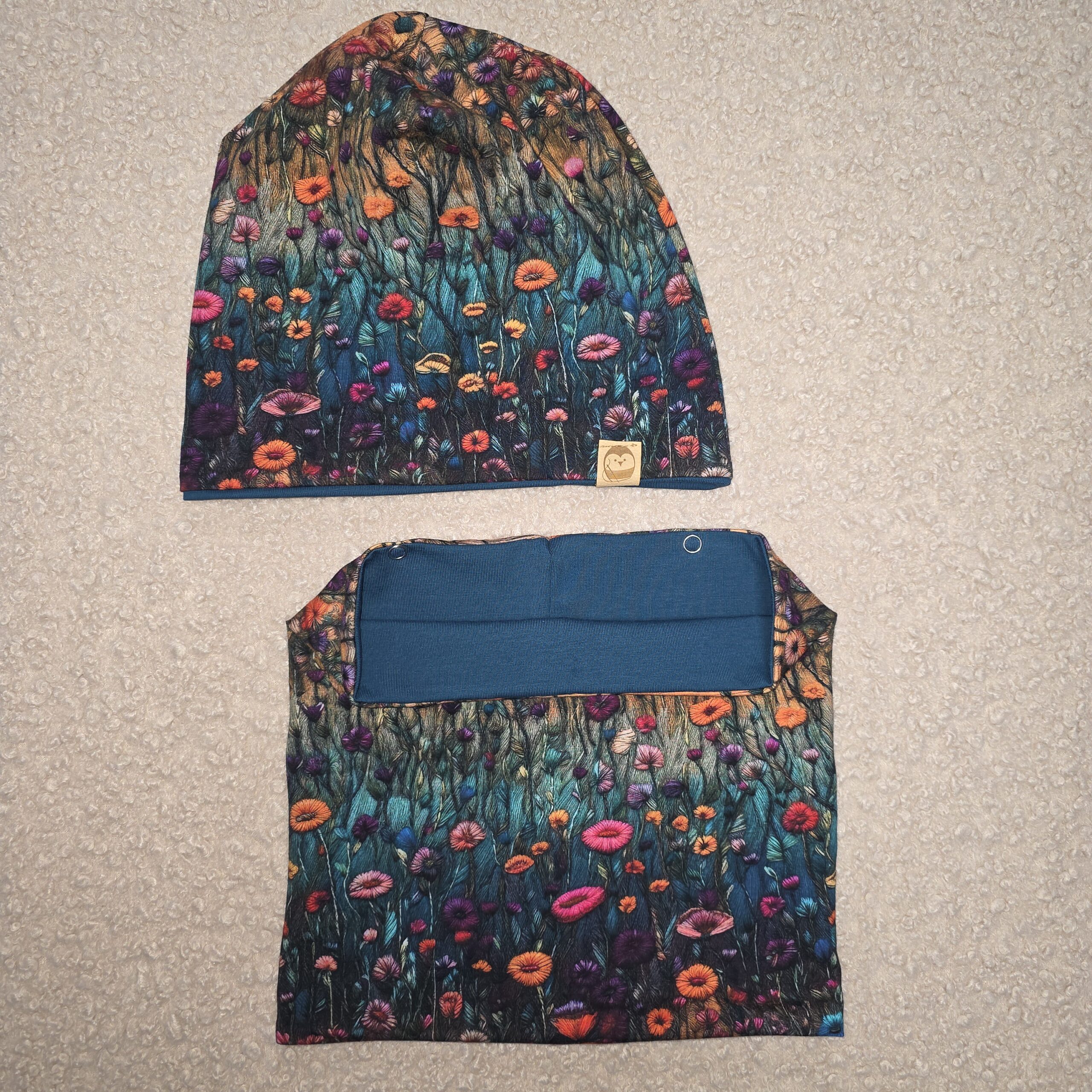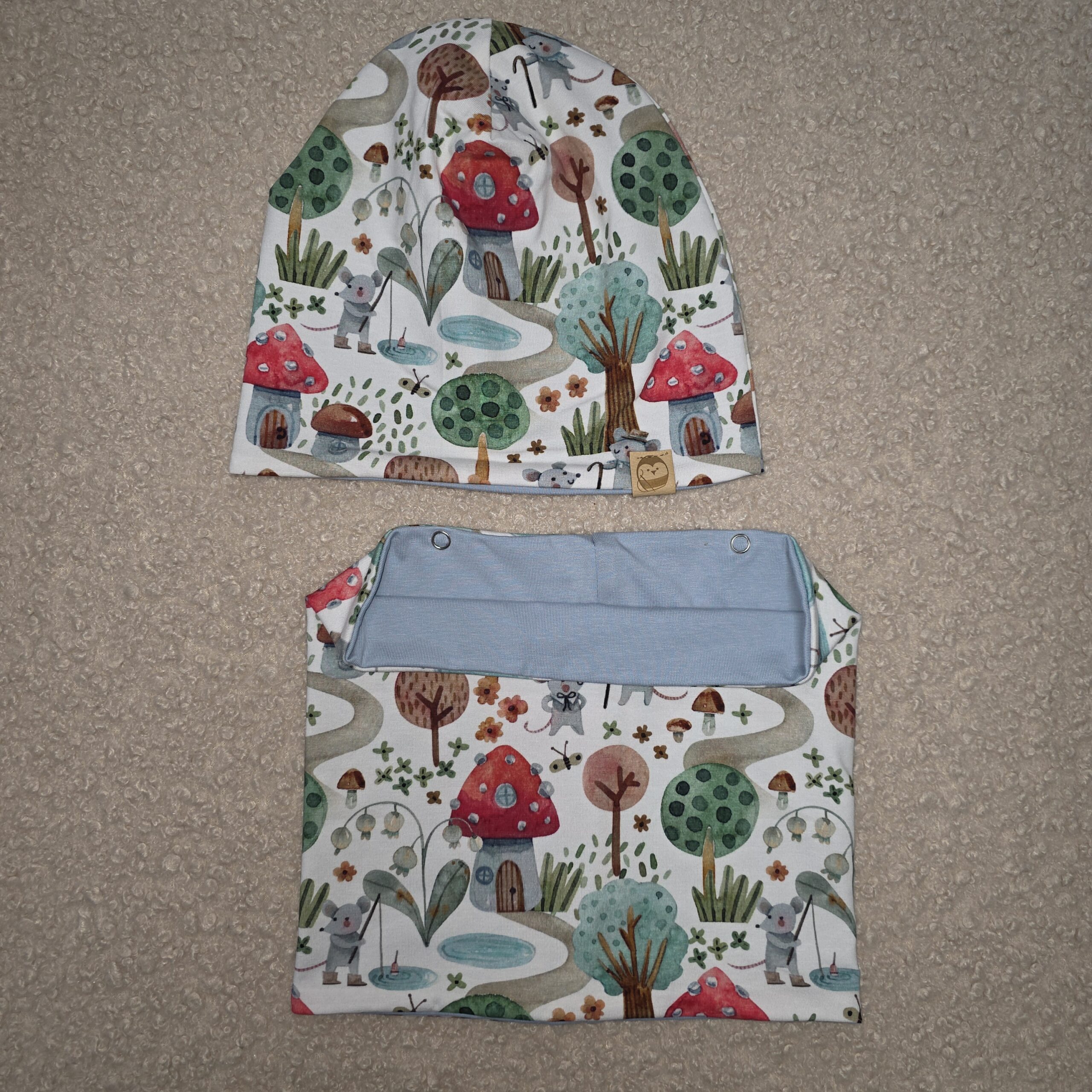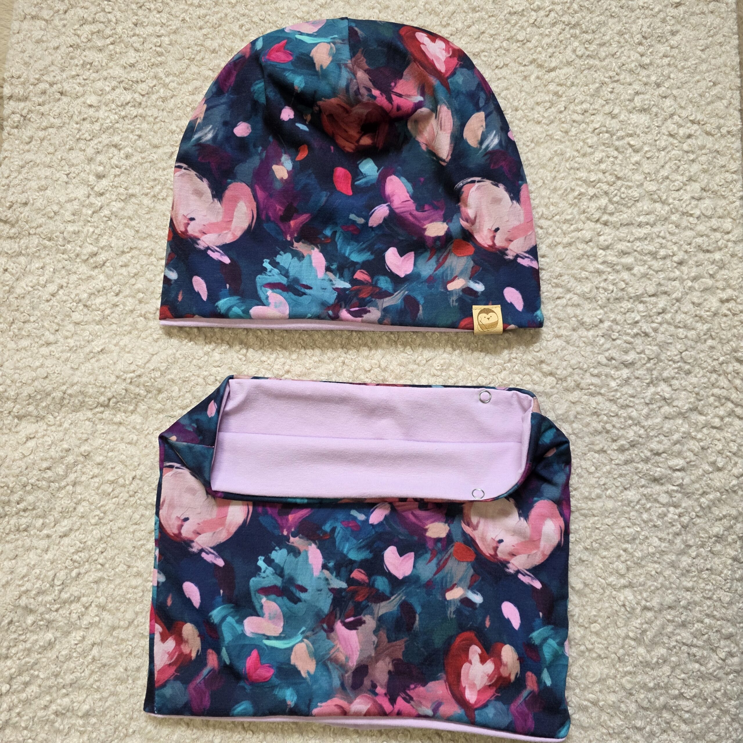 Az Anyacuka sapka-sál szett kétrétegű, rugalmas pamut jersey anyagból készült , ami az átmeneti időben rendkívül kényelmes viseletet biztosít.