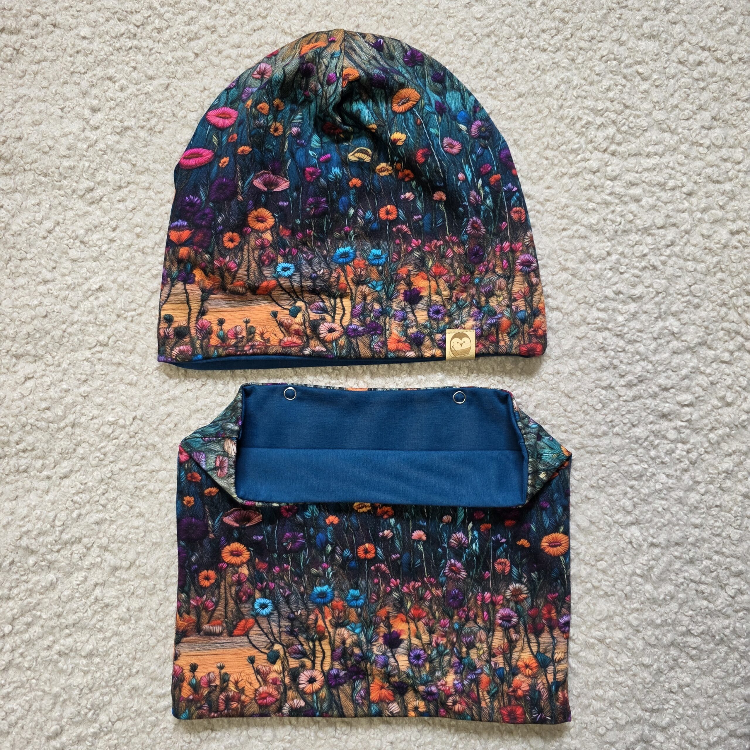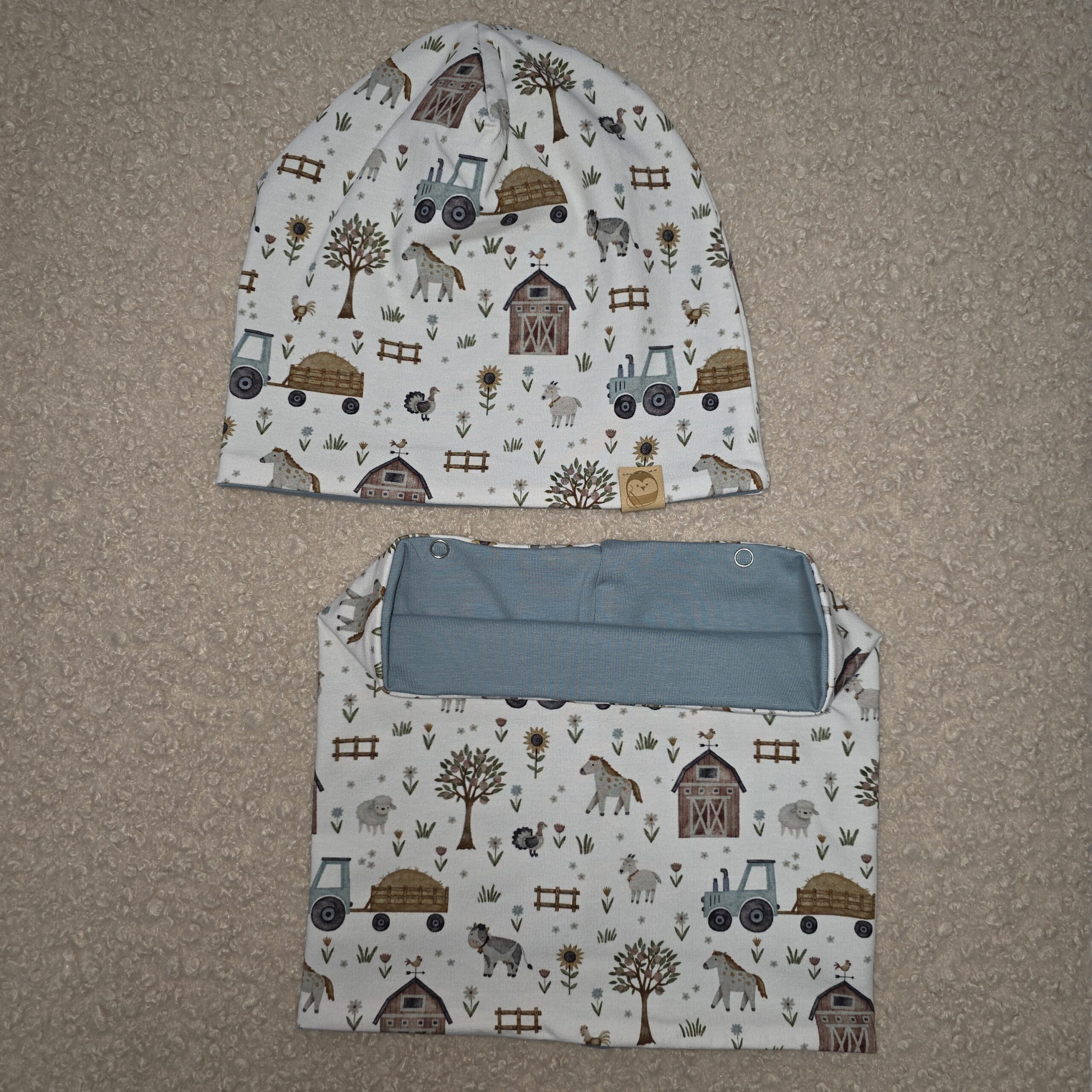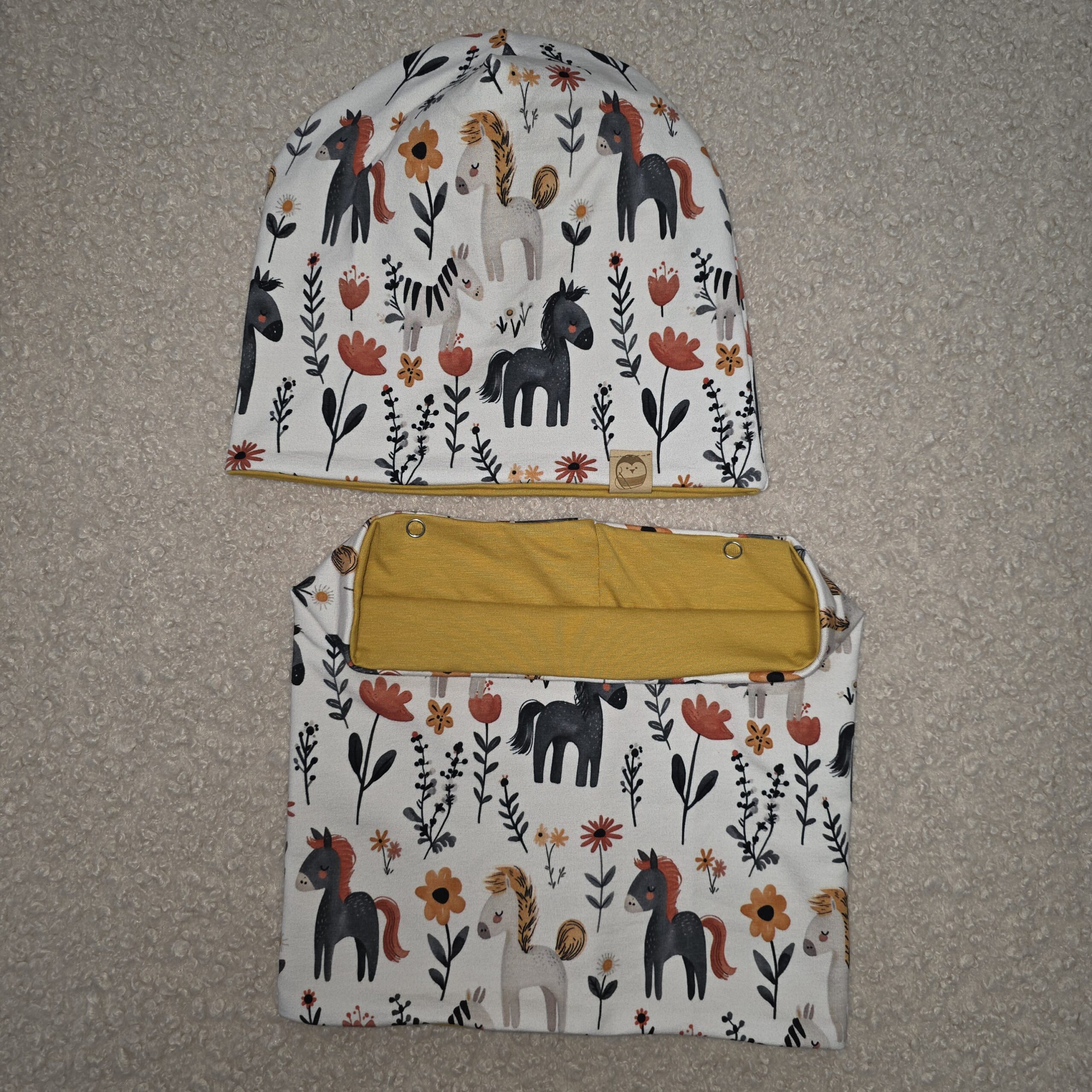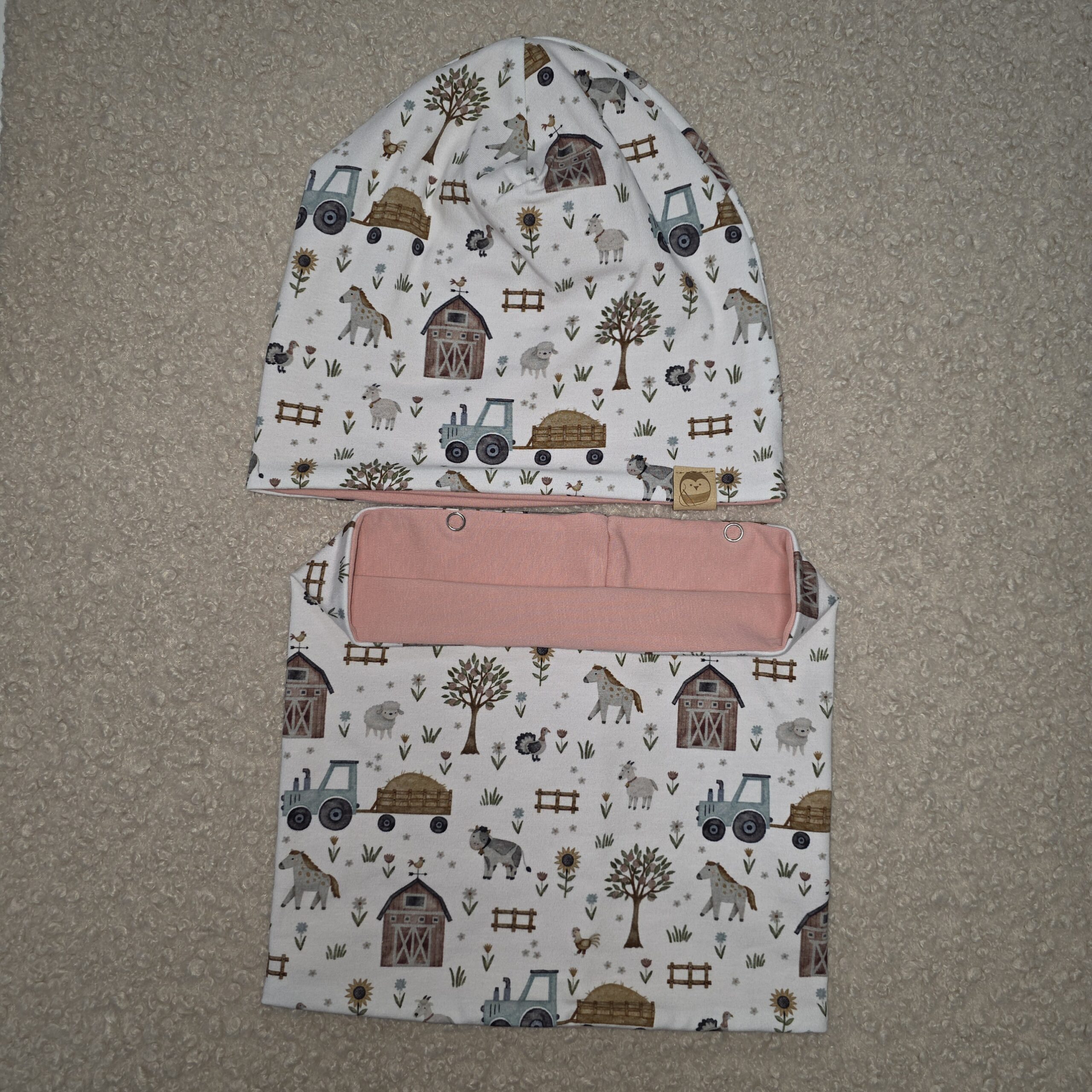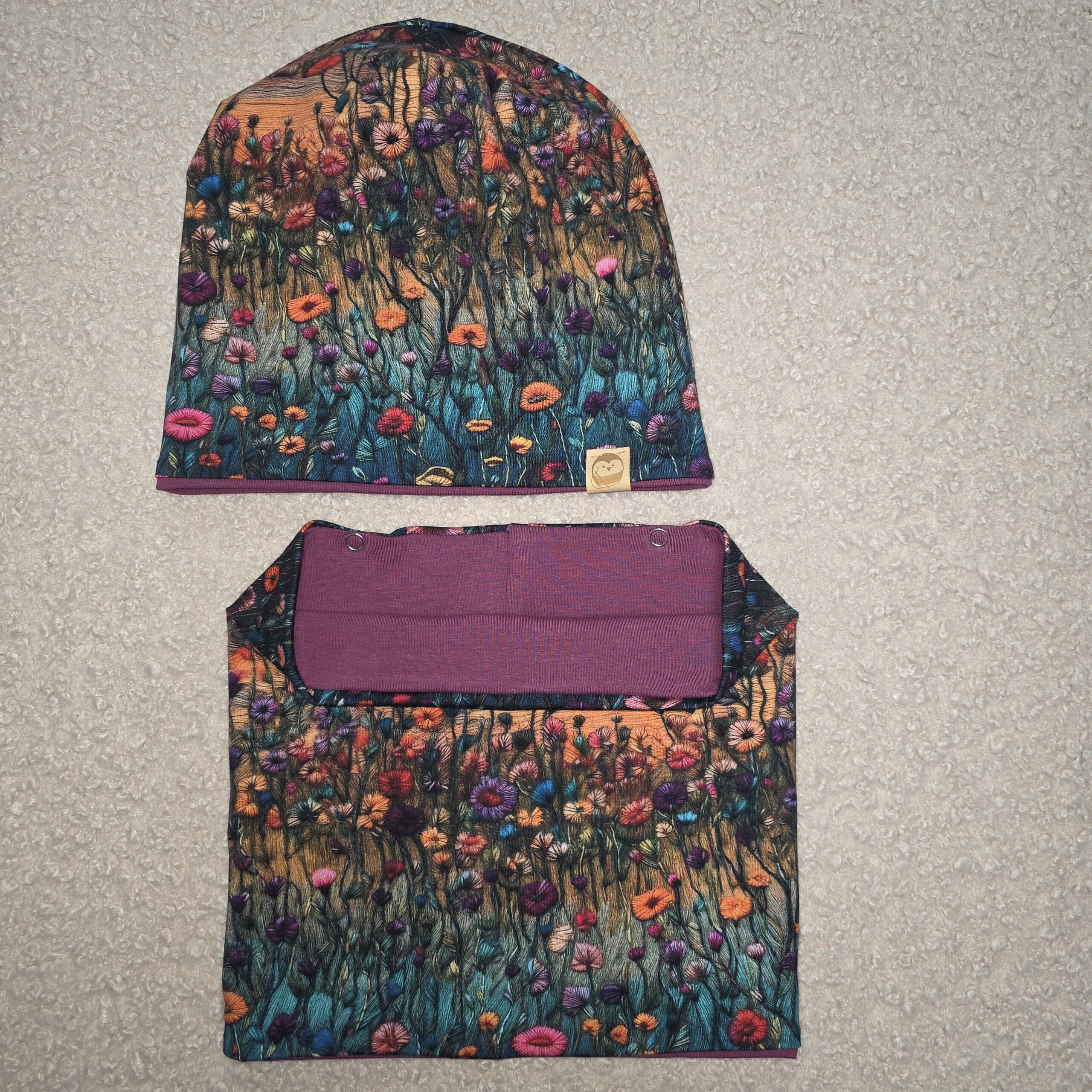 Az Anyacuka sapka-sál szett kétrétegű, rugalmas pamut jersey anyagból készült , ami az átmeneti időben rendkívül kényelmes viseletet biztosít.