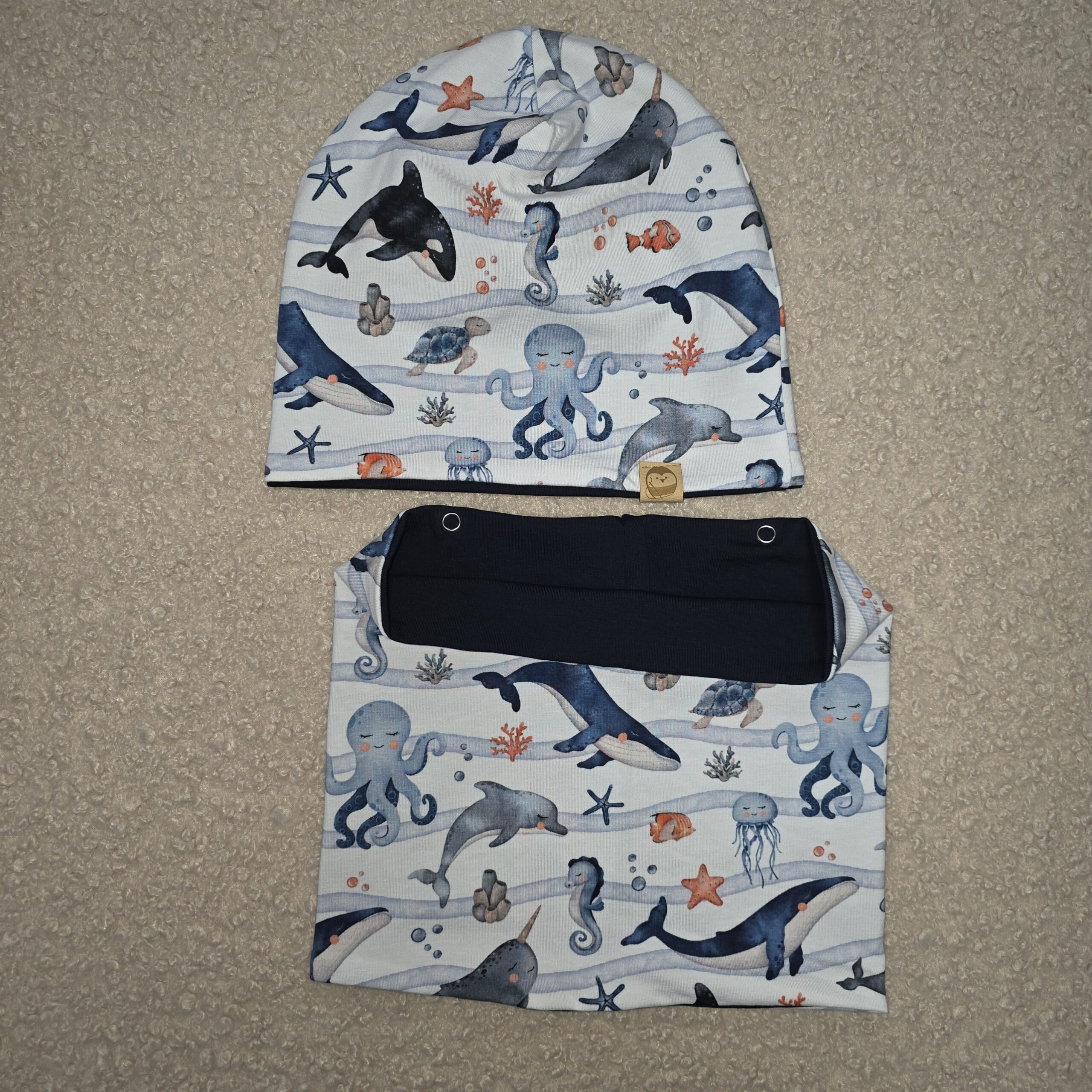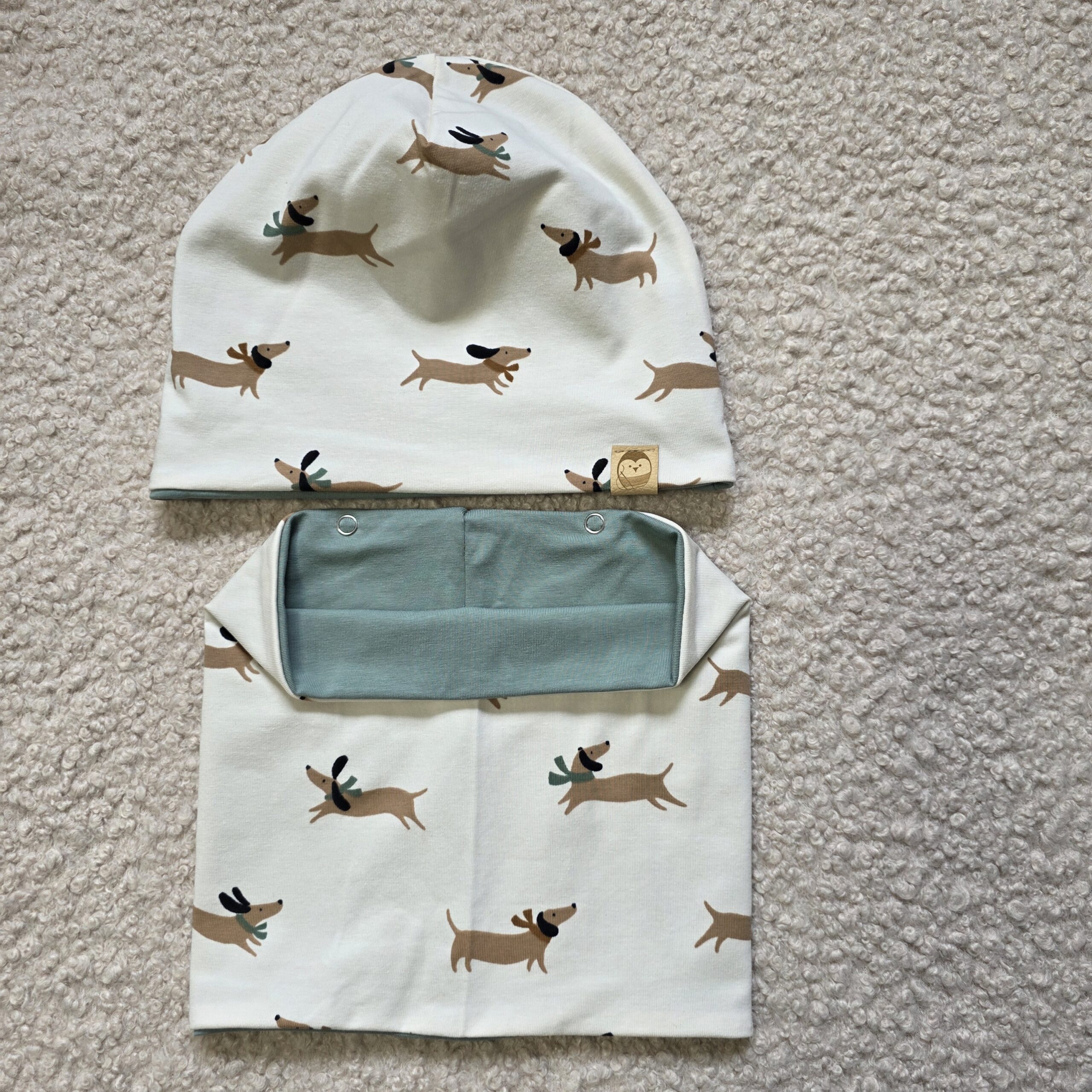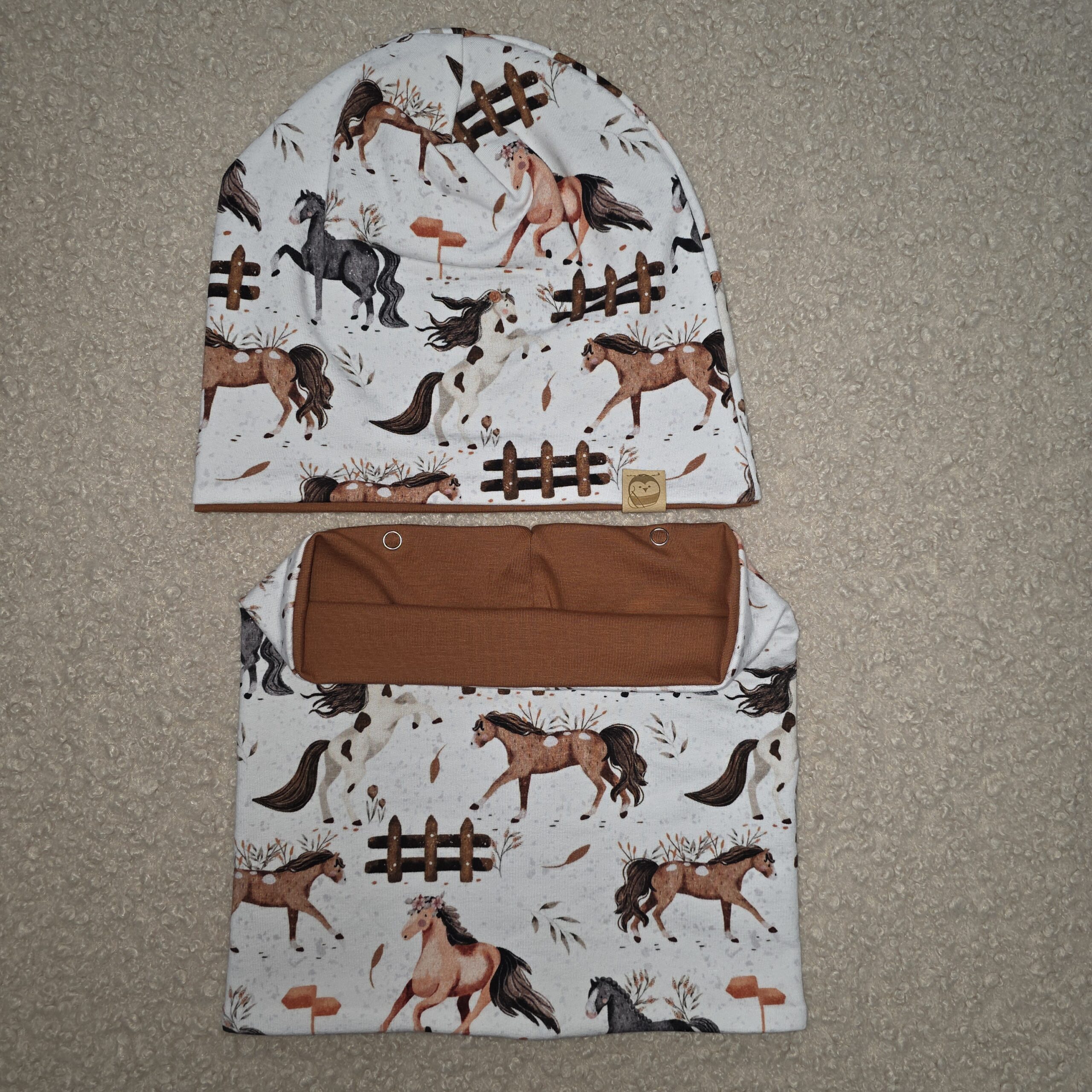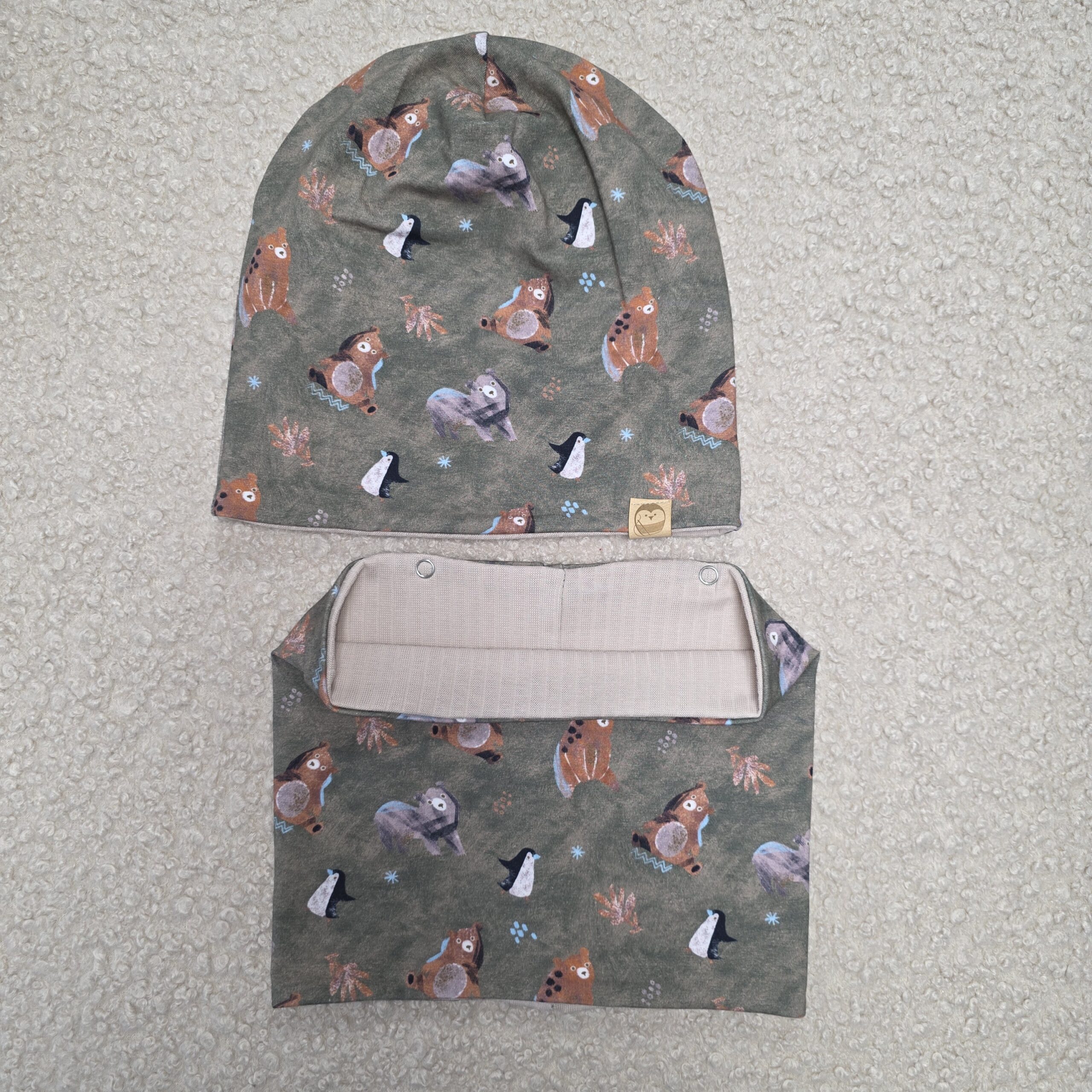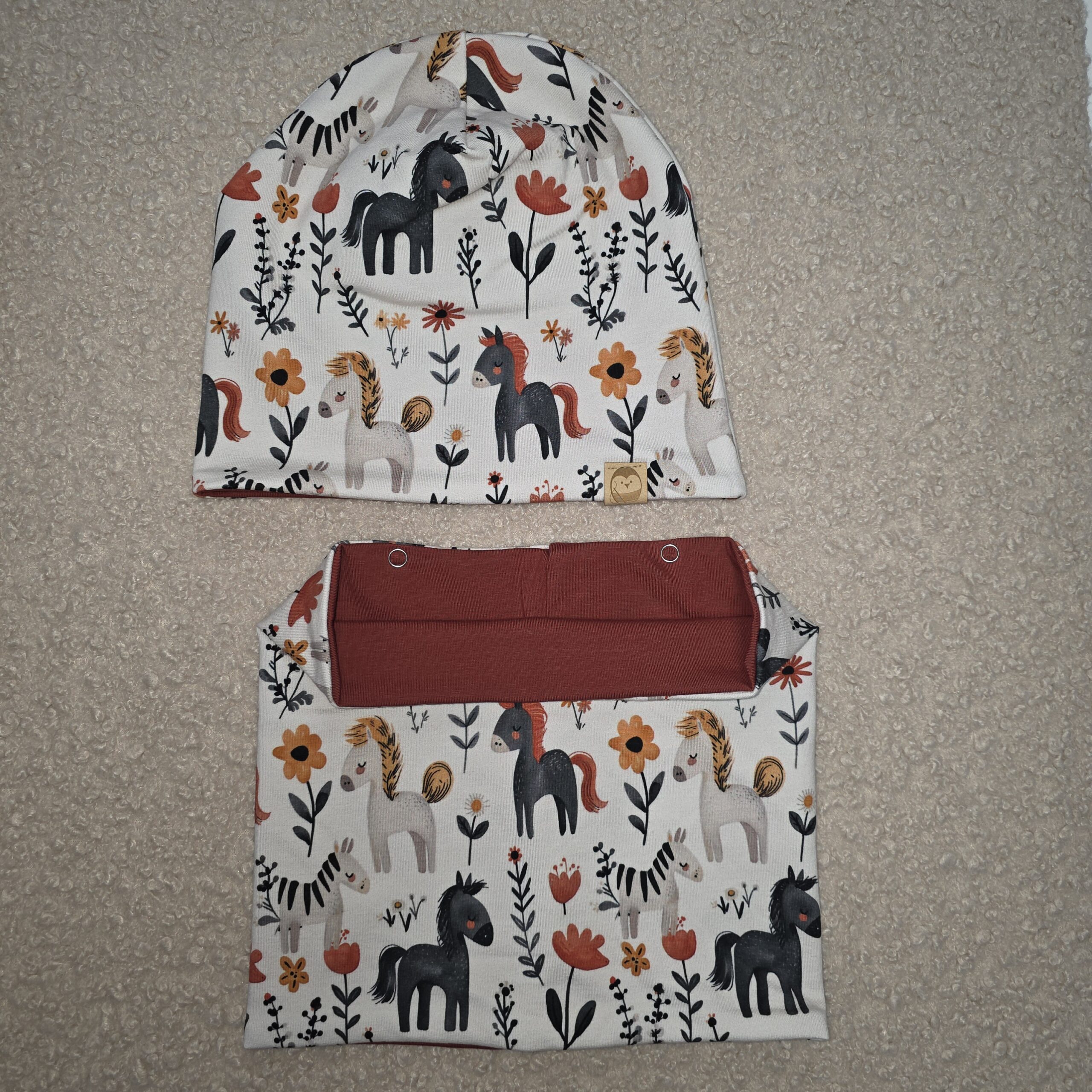 Az Anyacuka sapka-sál szett kétrétegű, rugalmas pamut jersey anyagból készült , ami az átmeneti időben rendkívül kényelmes viseletet biztosít.