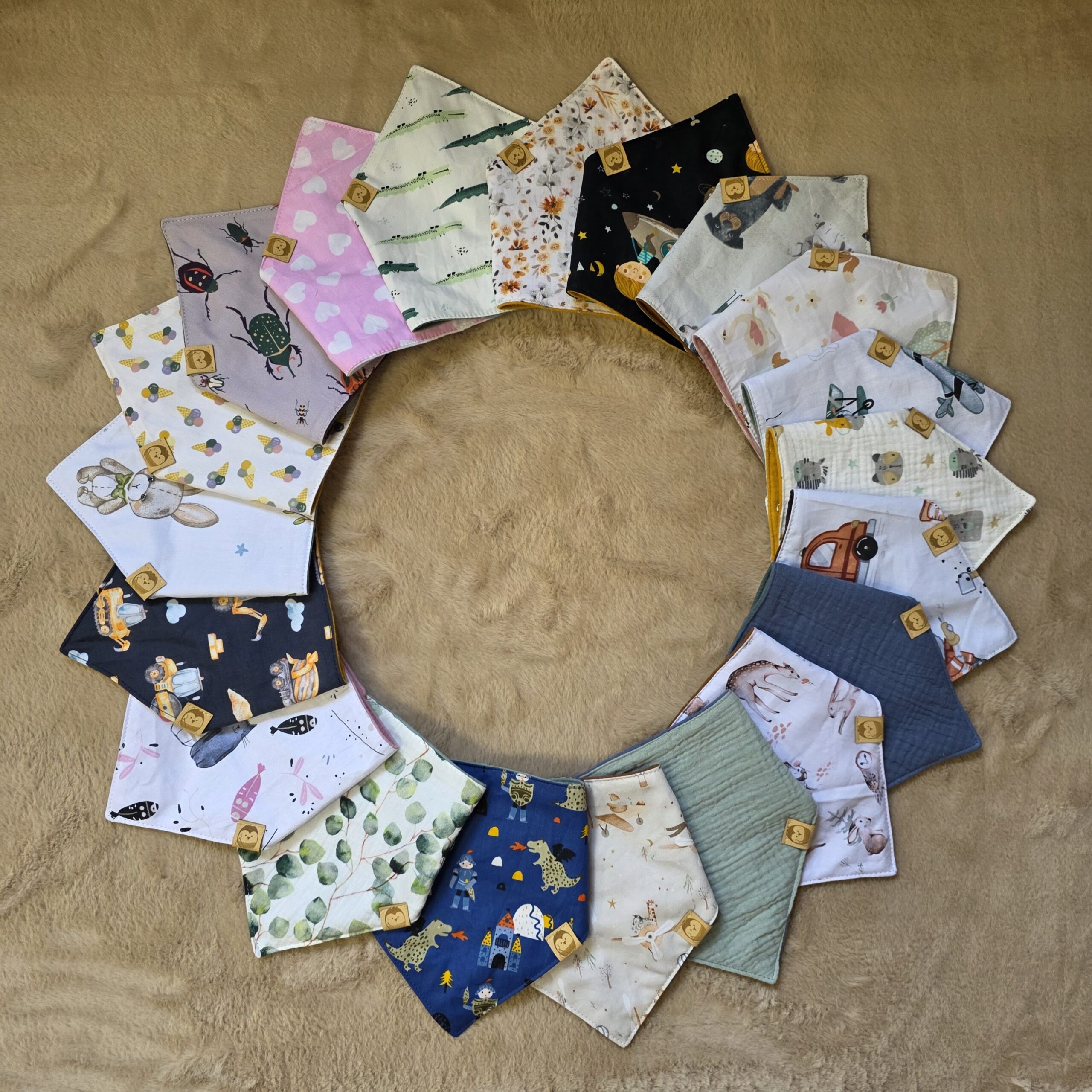 Az Anyacuka nyálkendők pamutvászon és duplagéz kombinációjából készülnek, és minden esetben közrefognak egy vízhatlan PUL réteget ami megakadályozza, hogy a ruha átázzon a kendő alatt.